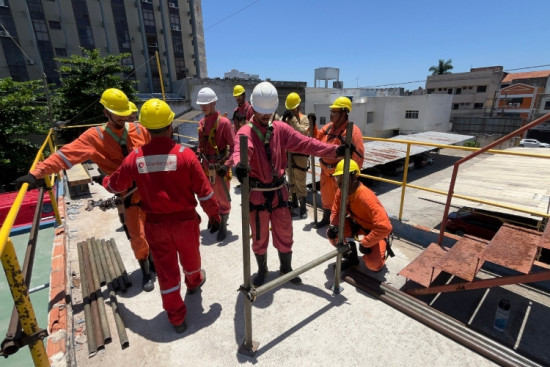 Enquanto a aula de Operador de Empilhadeira acontecia na região do Dom Atacadista, outra equipe participava da etapa prática do curso de Montador de Andaime na área central. A formação, desenvolvida em parceria com a ProSAL Cursos, está em sua terceira turma e segue o mesmo modelo híbrido. Durante a atividade deste sábado, o professor apresentou o cronograma previsto para o módulo presencial, com orientações sobre montagem segura das estruturas, cuidados com equipamentos de proteção e procedimentos adotados em obras.
