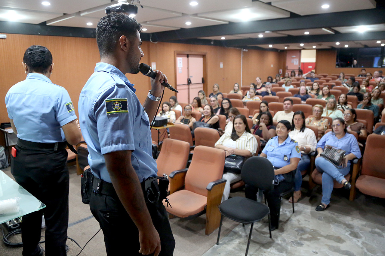 A palestra A atuação do Grupamento de Ronda Escolar foi voltada para gestores das unidades escolares da rede municipal e reuniu informações sobre prevenção, segurança e acolhimento no ambiente educacional