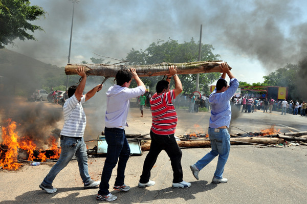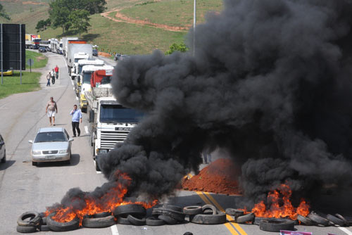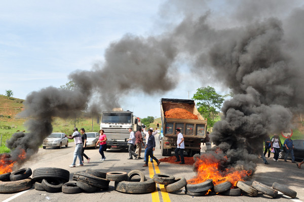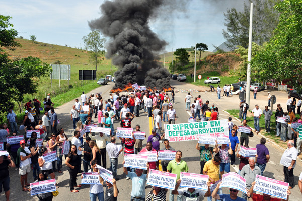 Centenas de pessoas estão com faixas e cartazes, indignados com o projeto do senador Vital do Rego, que redistribui os royalties para os demais municípios brasileiros. Os manifestantes bloquearam a rodovia com pneus e madeira, impedindo a passagem de carros de passeio, caminhões e motocicletas.