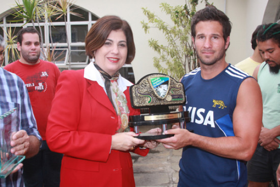 A Prefeita Rosinha Garotinho foi surpreendida na tarde desta quinta-feira (24) com uma homenagem feita por jogadores da equipe de Rugby da cidade de Mariano Moreno, de Buenos Aires, Argentina. Os jogadores estão em Campos para um torneio de integração com a equipe de Campos. A homenagem foi feita quando a prefeita chegou ao Sesi para participar de um seminário promovido pela Firjan, para debater a necessidade de planejamento regional para o desenvolvimento. O técnico argentino de Rugby, Ricardo Oscar Priore, que comanda a equipe de Campos, atuou como intérprete dos jogadores na entrega de uma placa de honra ao mérito à prefeita, pelo incentivo ao esporte em Campos, através da Fundação Municipal de Esportes.