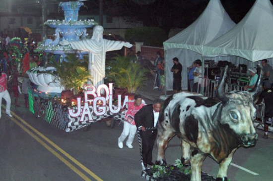 O Boi Jaguar entrou na avenida com uma homenagem ao consagrado carnavalesco, Edhuardo Rodrigues, que por muitas vezes conquistou o Carnaval de Campos. Com o tema “Iluminado pelo nosso criador. Edhuardo Rodrigues, brilha com muita alegria e amor”, o vermelho e branco do Turfe Clube agradou a todos e mostrou que tem condições de brigar pelo titulo.