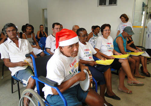 O coral Voz do Canto, formado por pacientes do setor de Reabilitação do Hospital Geral de Campos, se apresentou nesta terça-feira (13). Uma das componentes é a doméstica Irailma Barros dos Santos, 58 anos, vítima de isquemia. Ela perdeu a voz mas, aos poucos, vem recuperando a fala com a ajuda da musicoterapeuta Andréa Fornettane e da fonoaudióloga, Verônica Stumbo, responsáveis pelo trabalho.
