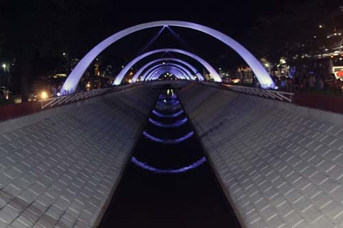 A cidade de Campos ganhou mais um cartão-postal no Centro da cidade na noite desta quinta-feira (22). Um grande público prestigiou a inauguração das obras de revitalização do Canal Campos-Macaé e das avenidas marginais, cuja solenidade foi conduzida pela prefeita Rosinha Garotinho e pelo vice-prefeito, Doutor Chicão, que fizeram um balanço dos três anos de governo. Após os discursos das autoridades, a prefeita convidou o público, estimado em cerca de quatro mil pessoas na Rodoviária Roberto Silveira, para atravessar o Canal e visualizar o túnel de luz metálica azul, formado pelos arcos que sustentam as bandejas do jardim suspenso sobre os taludes do Campos-Macaé.