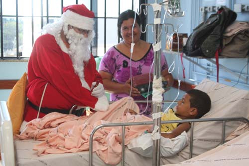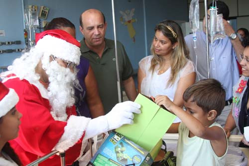 O vice-prefeito e presidente da Fundação Municipal de Saúde, Doutor Chicão, e a secretária de Educação, Joilza Rangel, visitaram os pacientes da pediatria e de outras enfermarias do hospital, com o Papai Noel, voluntários e funcionários, ao som de músicas natalinas, distribuindo presentes, livros de literatura infantil e panetones. O Natal Humanizado contou também com a participação da aluna da rede municipal, Paola Barreto, de 9 anos, que contou histórias para as crianças.