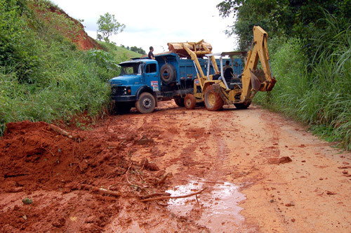 Máquinas da Secretaria Municipal de Agricultura e Pesca estão auxiliando na recuperação de estradas no município. Um caminhão e uma retroescavadeira realizam um intenso trabalho de desobstrução de barreiras na estrada que liga a localidade de Palmares ao distrito de Murundu.