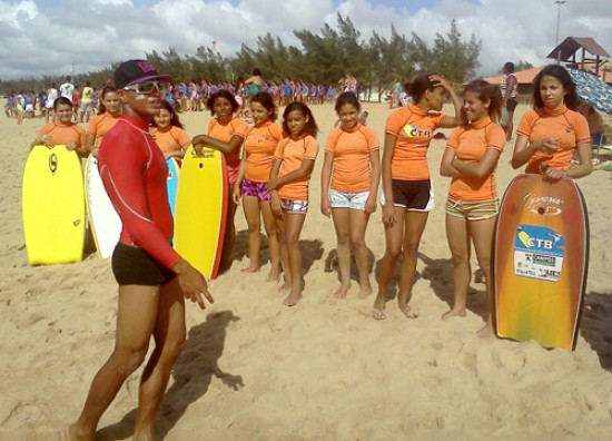 Meninas aderem ao bodyboard na praia do Farol