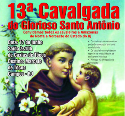 Neste domingo (17), acontece a 13ª Cavalgada do Glorioso Santo Antonio, em Marcelo de Tócos com saída em Caxias do Tócos, às 11h. A prova dos três tambores também será realizada no domingo, nas categorias infantil, amador e profissional. A prefeitura de Campos, através da Fundação Cultural Jornalista Oswaldo Lima e a Guarda Civil Municipal, estão apoiando o evento. A chegada será em Marcelo de Tócos e está prevista para às 14h.