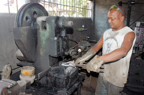 Micro crédito abre novas perspectivas - O trabalho das ferrarias é artesanal, porque é uma atividade que vem de um tempo quando o mundo rodava mais devagar. Mas, devido as demandas dos tempos atuais, Edval percebeu a necessidade de adquirir maquinário simples que dá agilidade nos trabalhos. Para evitar milhares de marretadas por dia sobre as bigornas, ele desenvolveu, por exemplo, um batedor de ferro, que poupa braço e horas de trabalho por dia. Mas Edval tem mais metas, como a aquisição de uma máquina de produzir cravos de ferradura (de cabeça quadrada e corpo afunilado), tendo em vista a dificuldade de se produzir artesanalmente a peça e, também, pelo fato de se encontrar fornecedor.