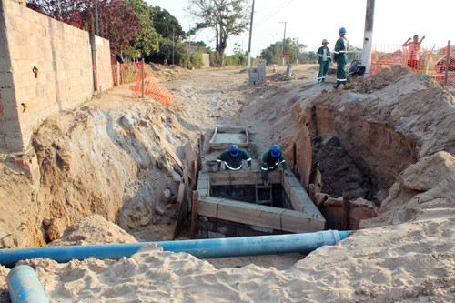 Na rua Clécio Pinheiro, após a ponte que vai para a estrada da Tocaia, está sendo implantada a galeria de águas pluviais, com a instalação d a rede de manilhas e a caixa de passagem com elevatória. As galerias tem manilhas de até 1200 metros e caixas de 2 m².