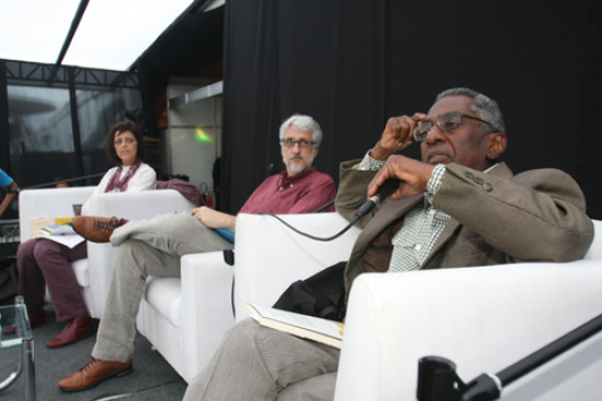 No quarto dia da 7ª Bienal do Livro do Campos, nesta segunda-feira (26) no Espaço Café Literário, foi debatido o tema da “Africanidade” pelos escritores Ninfa Parreiras e Joel Rufino dos Santos, autor de “Gosto de África”, “História de Lá e de Cá“, “Zumbi”, “Coleção Curupira” (Kalunga), “O que é racismo?”, entre outros livros que abordam questões relativas à população negra. A mediação coube ao professor Leonardo Vasconcelos.