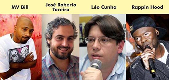 MV Bill - MV Bill é conhecido desde o início de sua carreira dentro da área musical, em 1988, quando começou a escrever sambas-enredo para seu pai. Seu primeiro álbum foi lançado em 1999 (Traficando Informação) e daí pra cá, outros sucessos o firmaram na carreira artística tais como Estilo Vagabundo, Só Deus Pode Me Julgar, Estilo Vagabundo Parte 2, Soldado do Morro e Causa E Efeito. Um documentário que conta a história de dezessete jovens que se envolveram com o tráfico de drogas também lhe deu notoriedade. Já o Rappin Hood, que começou a compor com 14 anos de idade, lançou seu primeiro disco solo em 2001, intitulado “Sujeito Homem”, que teve participações de rappers como Xis, Black Alien e outros.