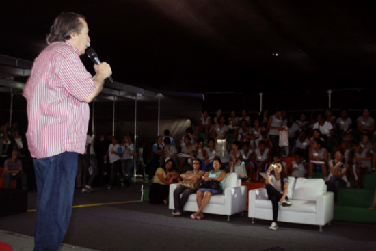 Ao final da palestra, o autor teve uma conversa mais íntima com os educadores, os incitando a buscar das crianças com mais dificuldade de aprendizado as formas com as quais eles se interessem pela leitura, seja lendo gibi, notícias de futebol ou piada. –O importante é ler– ressaltou Pedro Bandeira.