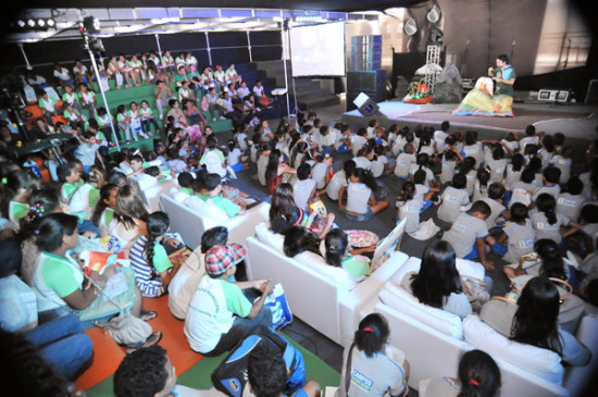 A 7ª Bienal do Livro de Campos está recebendo nesta sexta-feira (30) dezenas de escolas públicas e particulares, cujos alunos podem passear para comprar livros e contam também com apresentações em espaços como Espaço Jovem e Leituras na Caverna. O grupo Tapetes Contadores de Histórias já se apresentou para a criançada com o espetáculo “Bicho do Mato”. Três atores do grupo, Cadu Cinelli, Edison Mego e Rosana Reategui, encantaram os presentes no local, que interagiram e não desgrudaram os olhos da apresentação.