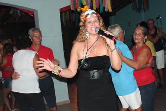 A cantora Neiva Brasil fechou com chave de ouro o carnaval na Colônia de Férias da Terceira Idade, na praia de Farol de São Thomé, nesta terça-feira (12). A cantora, fantasiada de colombina, combinando com as máscaras que decoravam o ambiente, chamou as cerca de 300 pessoas presentes para cantar e dançar ao som do forró, axé, entre outros ritmos, brincando com a platéia que as pessoas livres e desimpedidas podiam até se beijar na boca.