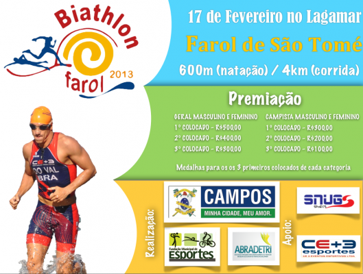 A Fundação Municipal de Esportes (FME) prorrogou até, este sábado (16), as inscrições para o Biathlon, que será realizado em parceria com a Associação Brasileira para Desenvolvimento do Triathlon (Abradetri), neste domingo (17), a partir das 9h, no Lagamar. As inscrições são gratuitas e podem ser feitas no site www.snugsports.com.br. As vagas são limitadas a 150 atletas, acima de 16 anos, sem limite máximo de idade. O evento encerra a programação esportiva do Verão da Família 2013 da Prefeitura de Campos na praia do Farol de São Tomé.