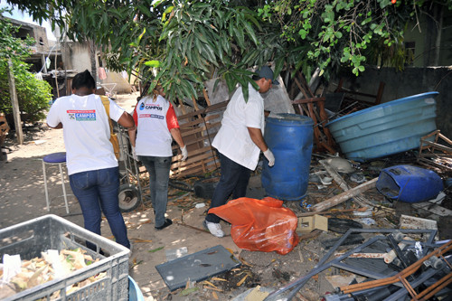 Em uma rua próxima à de Gabriela, a São João, os agentes de endemia tiveram bastante trabalho para recolher materiais numa casa, com latas, garrafas e madeiras espalhadas. Criadouros do mosquito, como uma lata cheia de larvas do Aedes Aegypti, foram removidos pelos agentes de endemia. No local, o secretário municipal de Saúde, Geraldo Venâncio, que acompanhava o trabalho, pediu permissão e o proprietário autorizou que uma equipe da Secretaria de Serviços Públicos, com um caminhão, fizesse a remoção dos entulhos que não puderam ser retirados pelo pessoal do CCZ.