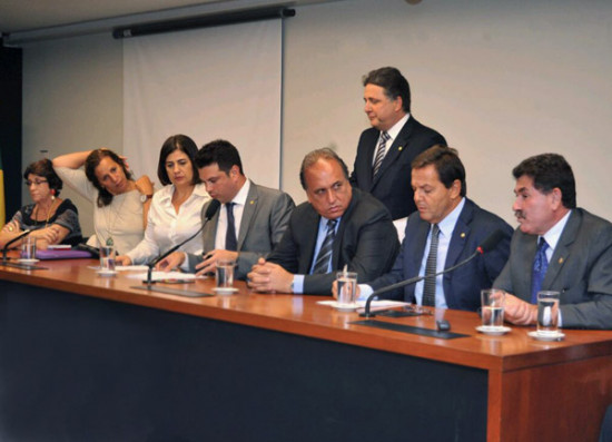 A prefeita Rosinha Garotinho, presidente da Ompetro, participa neste momento da mesa de reunião da bancada federal na Câmara dos Deputados, com participação do vice-governador Luiz Fernando Pezão, prefeitos, deputados federais e estaduais. A prefeita sugeriu aos municípios que sigam o caminho adotado por Campos, que irá entrar com ação na Justiça Federal para arguir a perda de receitas constitucionais que são os royalties e o impacto nas administrações públicas, que se inviabilizarão e terão que responder à Lei de Responsabilidade Fiscal.