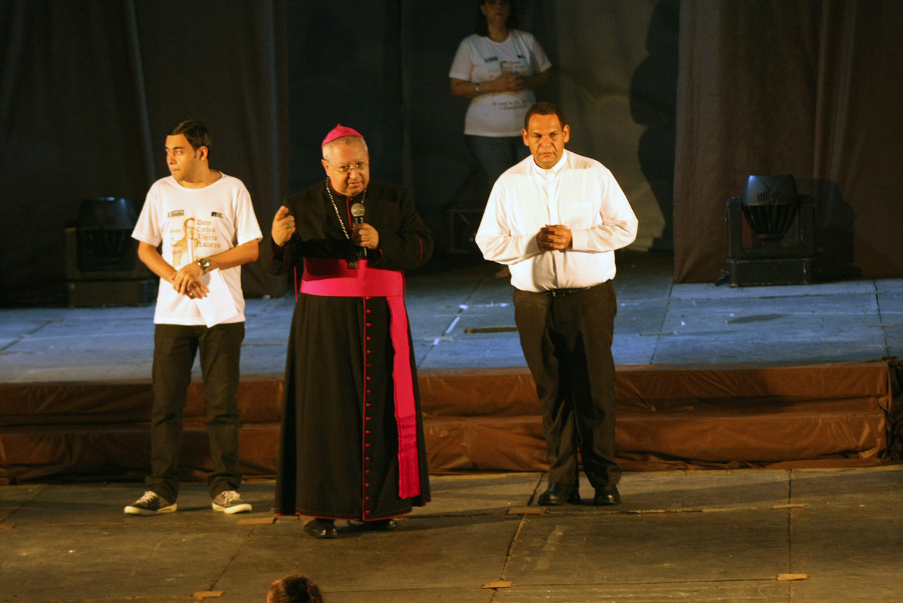 Antes da encenação, o Bispo Diocesano de Campos, Dom Roberto Francisco Ferrería Paz, falou ao público, destacando a importância do trabalho dos atores que encenam a Via Sacra. “Vocês são, além de atores, missionários, reproduzindo, com empenho e perfeição, esta mensagem através do teatro. A todos, uma Semana Santa Abençoada”, disse Dom Roberto, que acompanhou a encenação ao lado do público.