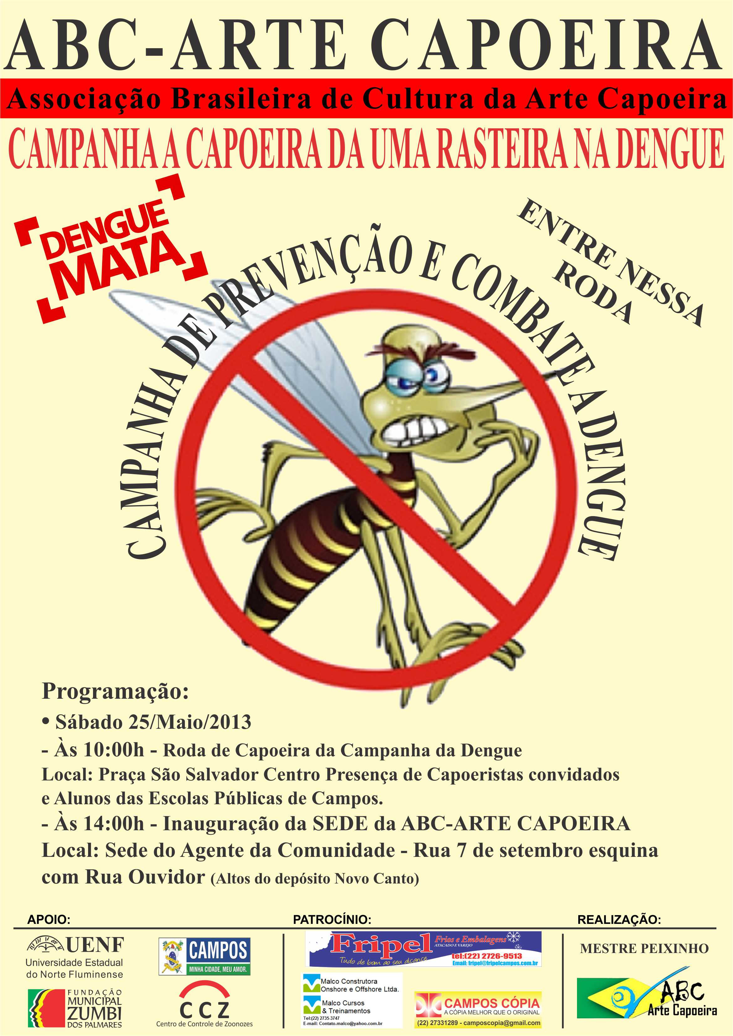 A luta no combate à dengue no município terá mais um grande reforço neste sábado (25) em Campos com a participação de alunos da Associação Brasileira de Cultura da Arte Capoeira (ABC-Arte Capoeira), do Mestre Peixinho, numa parceria com o Centro de Controle de Zoonoses (CCZ) e Fundação Zumbi dos Palmares. A iniciativa, denominada A Capoeira dá uma rasteira na dengue, acontece a partir das 10h, em frente à Caixa Econômica Federal, no Boulevard Francisco de Paula Carneiro, área central da cidade.