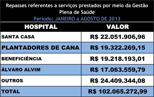 Este ano, o Hospital Santa Casa de Misericórdia, por exemplo, recebeu R$ 22.051.906,69, enquanto ao Hospital dos Plantadores de Cana foram repassados R$ 19.322.269,15. A Sociedade Portuguesa Beneficência de Campos recebeu R$ 19.218.193, 01, e o Hospital Escola Álvaro Alvim, R$ 17.063.559,79. Além dos hospitais, fazem parte da Gestão Plena, as Clínicas Psiquiátricas Abrigo João Viana e Henrique Roxo; os Laboratórios Labmed, Hemoclin e Plínio Bacelar; a Clínica Pró-Rim, com serviços de hemodiálise; e o Grupo IMNE, com oncologia.