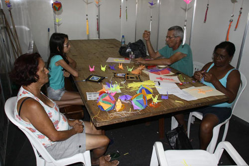 Nesta sexta-feira (07) uma grande quantidade de pessoas passou por lá. O mundo Infantil, como sempre, levando o agito e alegria para toda criançada com pinturas de corpo e rosto, brinquedos infláveis, aulas de dança que agitam a turma da adolescência, oficinas que são oferecidas pela Fundação Cultural (FCJOL), além de aula de origami, móbile Tesuru, com o professor Henrique Barreto.
