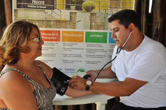 A Secretaria Municipal de Saúde desenvolve atividades, como medição de pressão arterial, no estande da Prefeitura, em Farol de São Thomé. A Secretaria oferece o apoio médico à população durante toda a programação do Verão da Família 2014, disponibilizando ambulância e profissionais da área da saúde.