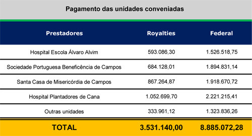O vice-prefeito e secretário de Saúde, Doutor Chicão, afirma que mais de R$ 500 milhões foram pagos às unidades de 2009 a 2013. “Este mês, pagamos R$ 3.531.140,00 referentes a recursos dos royalties e mais R$ 8.885.072,28 de verba federal”, disse. Ao todo, 17 entidades são contratualizadas, entre hospitais, clínicas e laboratórios de análises clínicas.