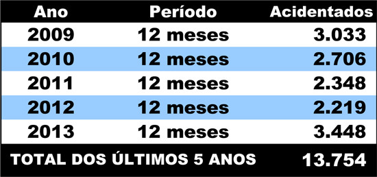 Nos últimos cinco anos, o Hospital Ferreira Machado (HFM) atendeu a 13.754 motociclistas acidentados. Somado ao primeiro bimestre deste ano, são 14.312 vítimas de acidente de moto. De 2009 a 2013, o número veio caindo de 3.033, em 2009, para 2.219, em 2012. Porém, houve um acréscimo no ano passado, quando 3.448 motociclistas sofreram algum tipo de acidente nas ruas e avenidas de Campos e região e foram socorridos no Pronto Socorro do HFM. Os dados foram divulgados pelo presidente da Fundação Municipal de Saúde (FMS), José Manuel Moreira. Ele classificou os casos como um problema de saúde pública e defende que o Ministério da Saúde faça uma campanha nacional de prevenção.