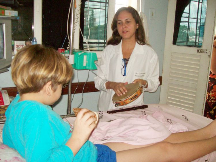 A musicoterapeuta Ana Cristina Mussalem percorre as enfermarias da Pediatria do HFM, três vezes por semana, com o auxílio de instrumentos musicais, como flauta e pandeiro, fazendo exercícios rítmicos e cantando com as crianças. “No ambiente hospitalar nos deparamos com o sofrimento, o medo e, com a música, o ambiente fica mais leve. Além da parte emocional, procuramos estimular a criatividade e o desenvolvimento infantil, fazendo com que as crianças, mesmo doentes, continuem produzindo”, afirma a profissional.