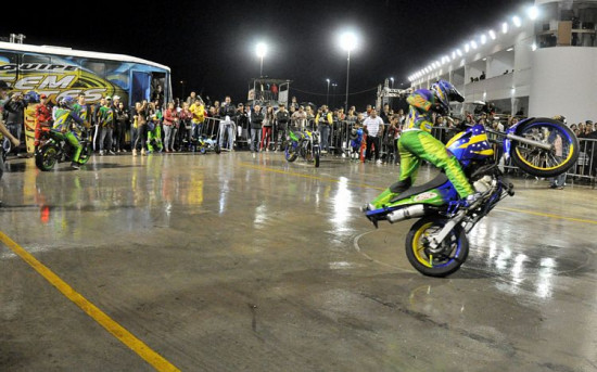 Segurança, técnica e perícia nas manobras radicais dos motociclistas da Equipe Sem Limites na noite deste sábado (26) durante o I Encontro Nacional de Todas as Tribos no Centro de Eventos Populares Osório Peixoto (Cepop). A chuva fraca e o frio não afastaram o público, que assistiu à apresentação de oito motociclistas do grupo comandado por Louro Jhow.