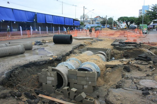 As obras de drenagem que vão acabar de vez com os constantes alagamentos que vinham acontecendo na Avenida José Alves de Azevedo, nas imediações do Mercado Municipal, prosseguem na área de interdição do trânsito, na Ponte Leonel Brizola, onde o problema apresentava uma maior gravidade, o que justificou a intervenção.