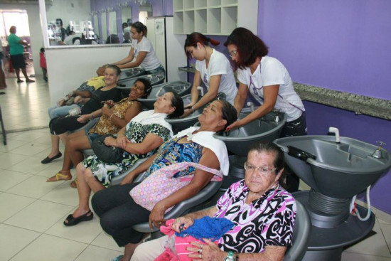 A aluna do curso de cabeleireiro, Jaira da Conceição Barreto, 21 anos, deu uma atenção especial ao “look” de dona Ana Maria Gonçalves, 65 anos, do Parque Lebret. “Vou lavar, fazer um corte repicado e escovar os cabelos dela”, contou a jovem aluna. “Tenho pouco cabelo e pedi um corte para ficar com mais volume. Estou achando muito bom o atendimento”, disse a idosa.