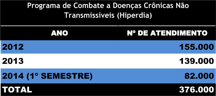 Em 2012 foram realizados aproximadamente 155 mil atendimentos; em 2013 foram 139 mil; enquanto, no primeiro semestre deste ano, o programa registrou cerca de 80 mil atendimentos. O Hiperdia cadastrou no sistema do Ministério da Saúde mais 40 mil hipertensos e diabéticos. Eles vêm recebendo assistência e apoio da Secretaria, no que diz respeito à orientação, prevenção e tratamento destas patologias, incluindo distribuição de medicamentos e insulina.