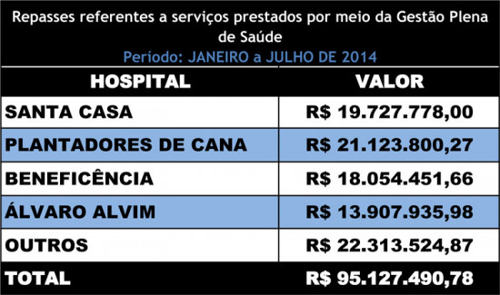 A Secretaria de Saúde repassou às instituições conveniadas, este ano, R$ 95.127.470,78 milhões de recursos provenientes dos royalties do petróleo e de recursos federais. Deste total, o Hospital dos Plantadores de Cana (HPC), Santa Casa de Misericórdia (SCM), Hospital Beneficência Portuguesa (HBP), Hospital Escola Álvaro Alvim (HEAA) e o Grupo IMNE receberam juntos, R$ 79.819.185,71.