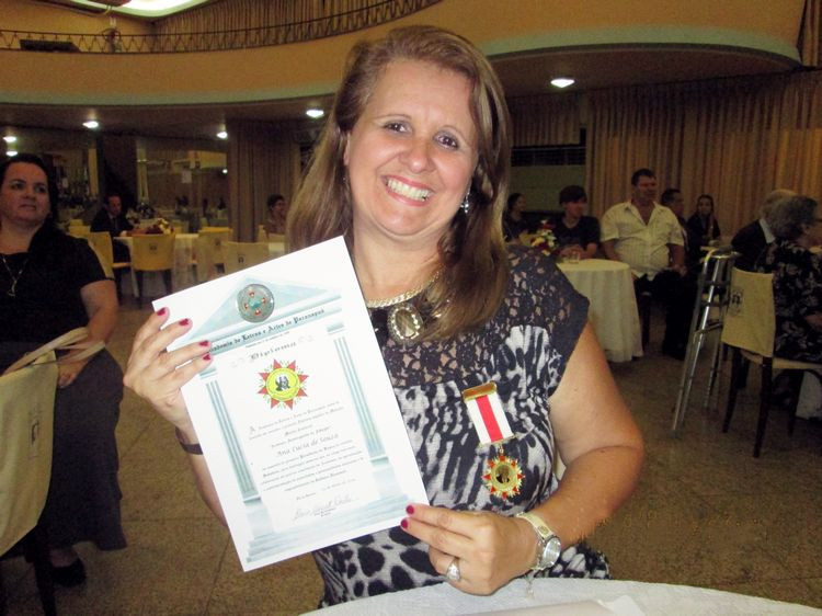 A coordenadora do Grupo Oficina de Textos Terra da Alegria (Gotta), professora Ana Lúcia Souza, foi homenageada com a Medalha Austregésilo de Athayde, um mérito cultural ao trabalho desenvolvido com alunos e ex-alunos da Escola Municipal Sebastiana Machado Silva, no IPS. A solenidade, realizada pela Academia de Letras e Artes de Paranapuã (Alap), aconteceu no Salão Nobre da Casa das Beiras, na Tijuca, no Rio, na terça-feira (28).