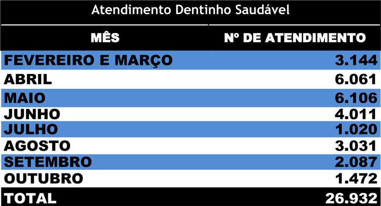 De fevereiro a outubro deste ano, o Programa Dentinho Saudável realizou 26.932 atendimentos nas creches da rede municipal. Os procedimentos realizados nas unidades escolares foram palestras, escovação supervisionada, aplicação tópica de flúor e exame clínico bucal nas crianças, além de teatro de fantoches, que mostra, de forma lúdica, a importância da escovação para prevenir cáries.