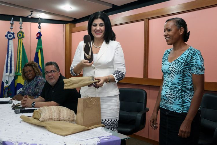 Dolores Paes dos Santos, que fez cursos de cartonagem e artesanato em fibra de bananeira, presentou a prefeita com uma das peças que customizou: uma sandália.