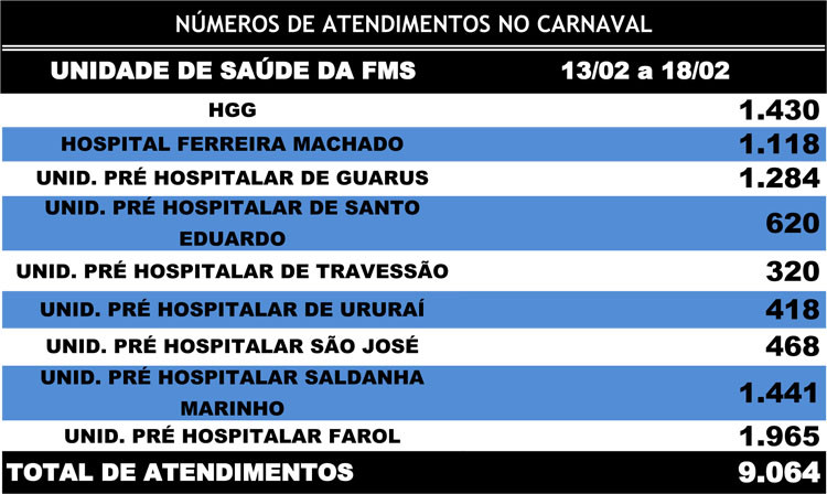 A Fundação Municipal de Saúde (FMS) divulgou nesta sexta-feira (20), o número de atendimentos de todas as suas Unidades Pré-Hospitalares (UPH) e também dos Hospitais Ferreira Machado e Geral de Guarus, durante o período de carnaval. Foram 9064 atendimentos nas nove unidades de saúde que compõem a FMS, de 13 a 18 de fevereiro.