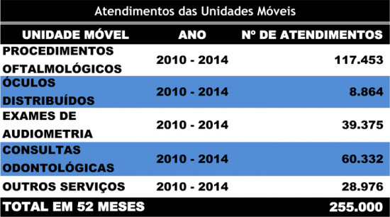 - Deste total, realizamos quase 83 mil atendimentos em 2010; 46 mil em 2011; 47 mil em 2012; 40 mil em 2013 e cerca de 40 mil em 2014. A maior parte dos serviços foi feita nas três unidades móveis de saúde: ônibus da odontologia, audiometria e oftalmologia, nas unidades escolares do município – informou o secretário de Saúde, Doutor Chicão.