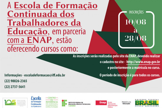 Os servidores da Prefeitura de Campos poderão fazer cursos gratuitos oferecidos pela Escola de Formação Continuada dos Trabalhadores da Educação, em parceria entre a Fundação Escola Nacional de Administração Pública (Enap) e o Instituto Federal Fluminense (IFF). Os cursos são: Elaboração de Indicadores de Desempenho Institucional (35 horas), Gestão e Fiscalização de Contratos Administrativos (21 horas) e Gestão Orçamentária e Financeira (35 horas).