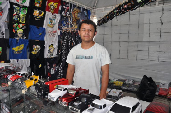 Ele acompanha o irmão há três meses e ajuda Paulo a administrar uma barraca com produtos como blusas, camisas esportivas, luvas, bonés, óculos, jaquetas, toucas equipamentos para motos, entre outros, com preços que variam entre R$ 20 e R$ 450.