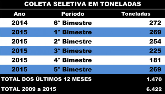 Nos últimos 12 meses 1.470 toneladas de materiais recicláveis foram recolhidos pelo Programa de Coleta Seletiva em mais de 5 mil pontos cadastrados em todo o município. Somente no 6º bimestre de 2014, o programa coletou 272 toneladas. Já nos 1º e 5º bimestres foram coletadas 269 toneladas em cada um.