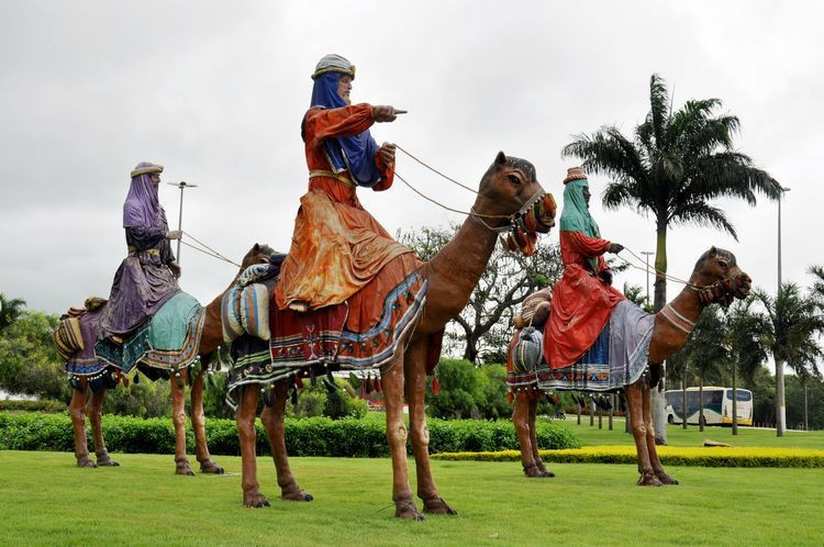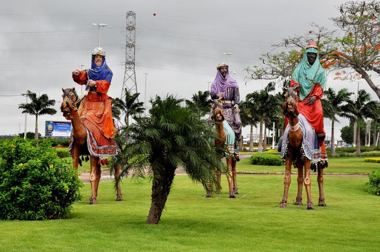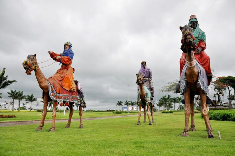 Reis em seus camelos na ornamentação natalina da entrada cidade