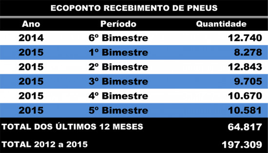 A Superintendência de Limpeza Pública realizou, nos últimos quatro anos, o recolhimento de 197.309 pneus no EcoPonto. Somente este ano, foram 52.077 pneus recolhidos e, nos últimos 12 meses, 64.817. Muitos dos pneus foram recolhidos em terrenos baldios, canais, rios e lagoas. O trabalho, além de contribuir para o meio ambiente, também, evita a proliferação do mosquito Aedes Aegypti, transmissor de doenças, como dengue, chikungunya e zika.