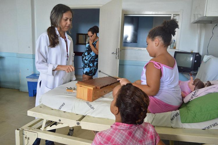 Com instrumentos musicais, como flauta, pandeiro e xilofone, entre outros, a musicoterapeuta da Fundação Municipal de Saúde (FMS), Ana Christina Mussalem, percorre os leitos da Pediatria do HFM fazendo exercícios rítmicos e cantando com as crianças. O serviço é desenvolvido no hospital há mais de quatro anos.