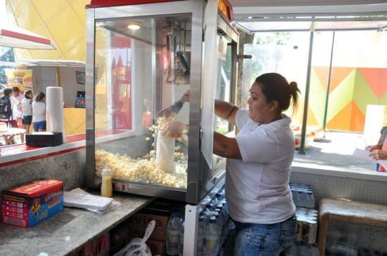 Já Tainara Félix passa a maior parte do tempo no quiosque, enchendo saquinhos com pipoca. São vendidos mais de 500 saquinhos aos sábados e domingos, quando o movimento mais do que triplica. “Não reclamo”, diz. Na loja de cachorro-quente, são vendidos 300 apenas nos fins de semana.