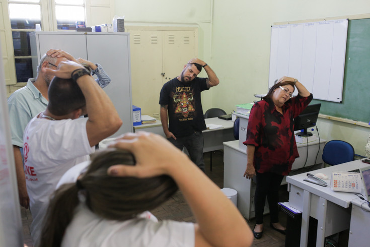 Durante a ginástica laboral, o professor Marcos chamou a atenção para a importância de dedicar alguns minutos do dia para esta atividade. A ginástica laboral tem três etapas: preparatória, compensatória e relaxamento.