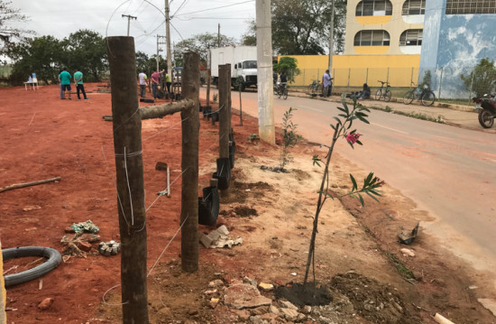 Nesta segunda (6), moradores do bairro instalaram cerca e pneus para jardim suspenso, em espaço próximo ao Ciep Clóvis Tavares