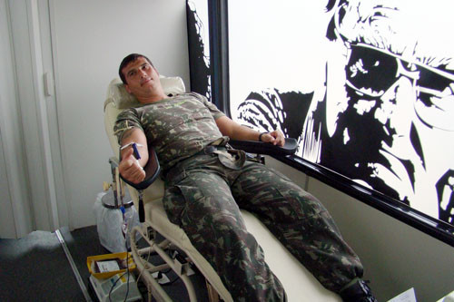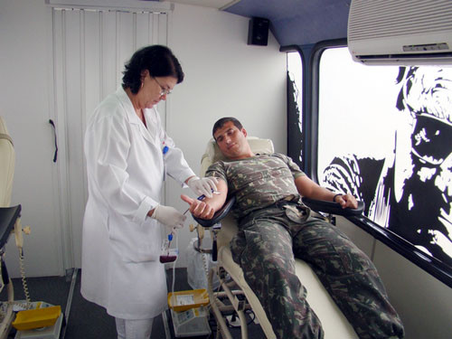 Teve início nesta quarta-feira (27) a parceria firmada entre o 56º Batalhão de Infantaria e o Hemocentro Regional de Campos, que prevê idas mensais da unidade móvel de coleta de sangue ao batalhão do exército. Durante todo o dia, a unidade móvel permaneceu no batalhão, coletando 32 bolsas de sangue. Entre os doadores, militares como o sargento Cristiano Caxéro, que aprovou a iniciativa do comandante do 56º BI, tenente-coronel Júlio César Evangelista dos Santos, que pretende organizar grupos mensais de doadores entre seus comandados. “A vinda da unidade móvel ao Exército vai facilitar bastante para nossos doadores”, diz Caxéro.