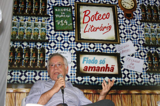 O jornalista, compositor, escritor, roteirista, produtor musical e letrista brasileiro, Nelson Motta, acompanhado do também escritor, Ruy Castro, lotou o espaço do Café Literário neste sábado (06) à noite, dentro da 6ª Bienal do Livro de Campos, montada na praça São Salvador. Nelson, que tem sua imagem diretamente ligada à música, começou afirmando que preferia não falar deste tema, na sua opinião, já discutido todos os dias, mas aproveitando que estava numa bienal do livro, falar de literatura.